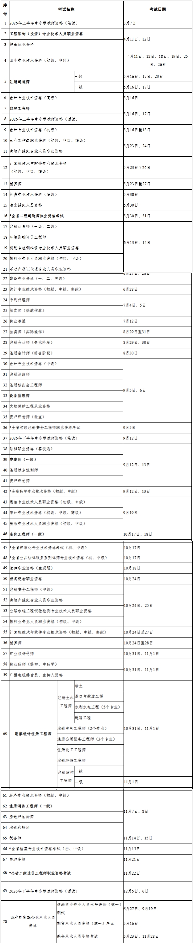 一、请按照《2026年度专业技术人员职业资格考试工作计划》(见附件),认真做好组织实施工作,确保各项考试安全顺利进行。证券期货基金业从业人员资格各次考试地点不同,计算机技术与软件专业技术资格、精算师上下半年的两次考试科目不同,具体安排以相关考试公告为准。如遇特殊情况需要变更考试日期的,另行通知。