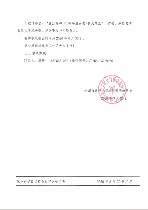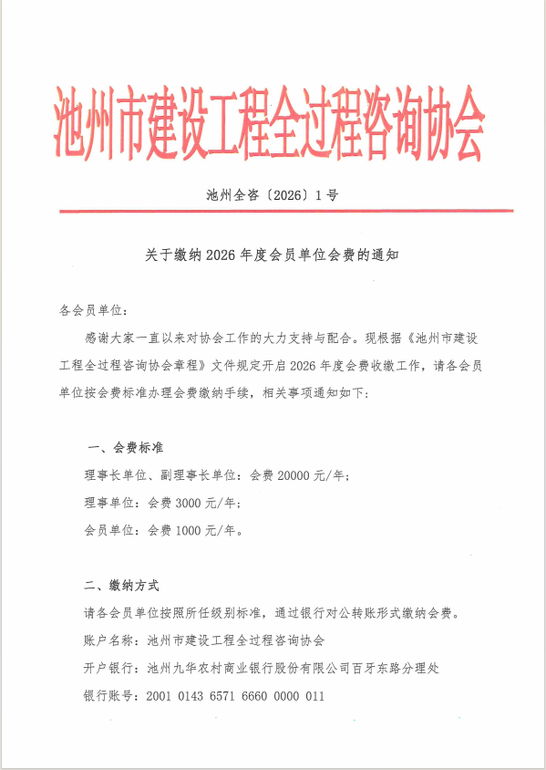 感谢大家一直以来对协会工作的大力支持与配合。现根据《池州市建设工程全过程咨询协会章程》文件规定开启2026年度会费收缴工作,请各会员单位按会费标准办理会费缴纳手续。