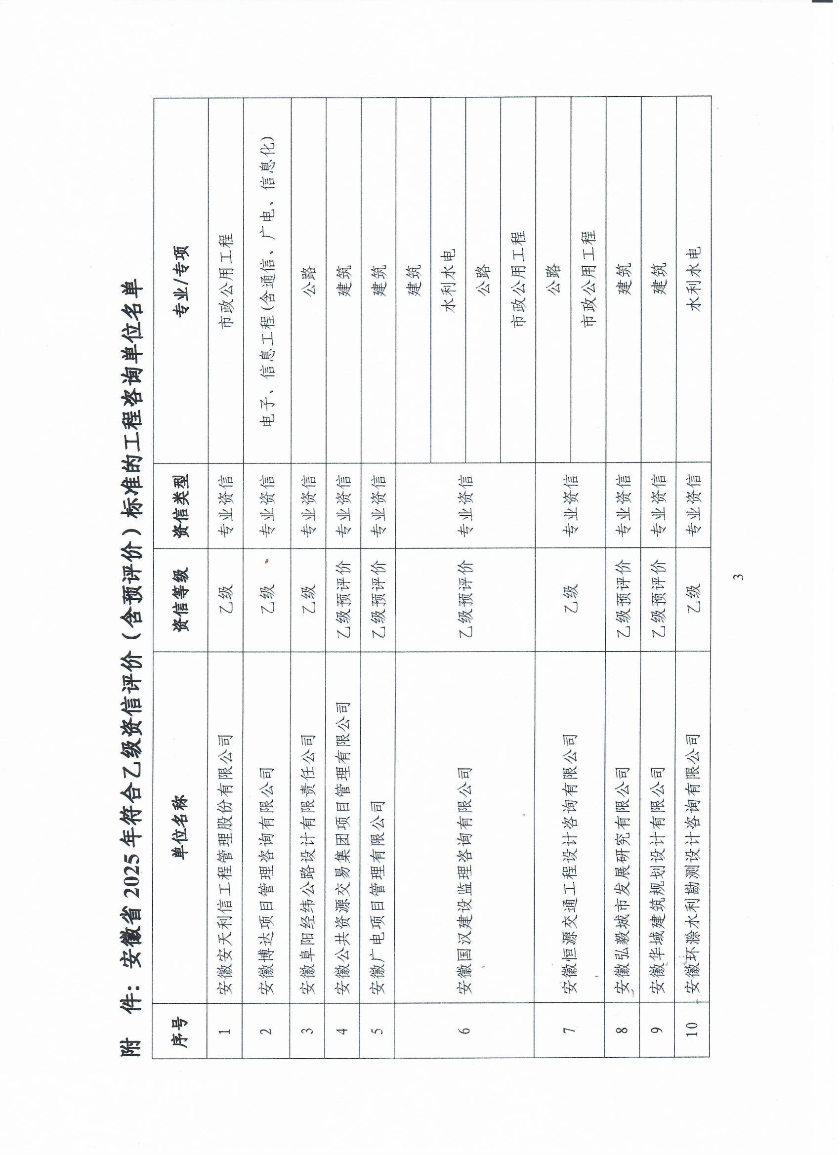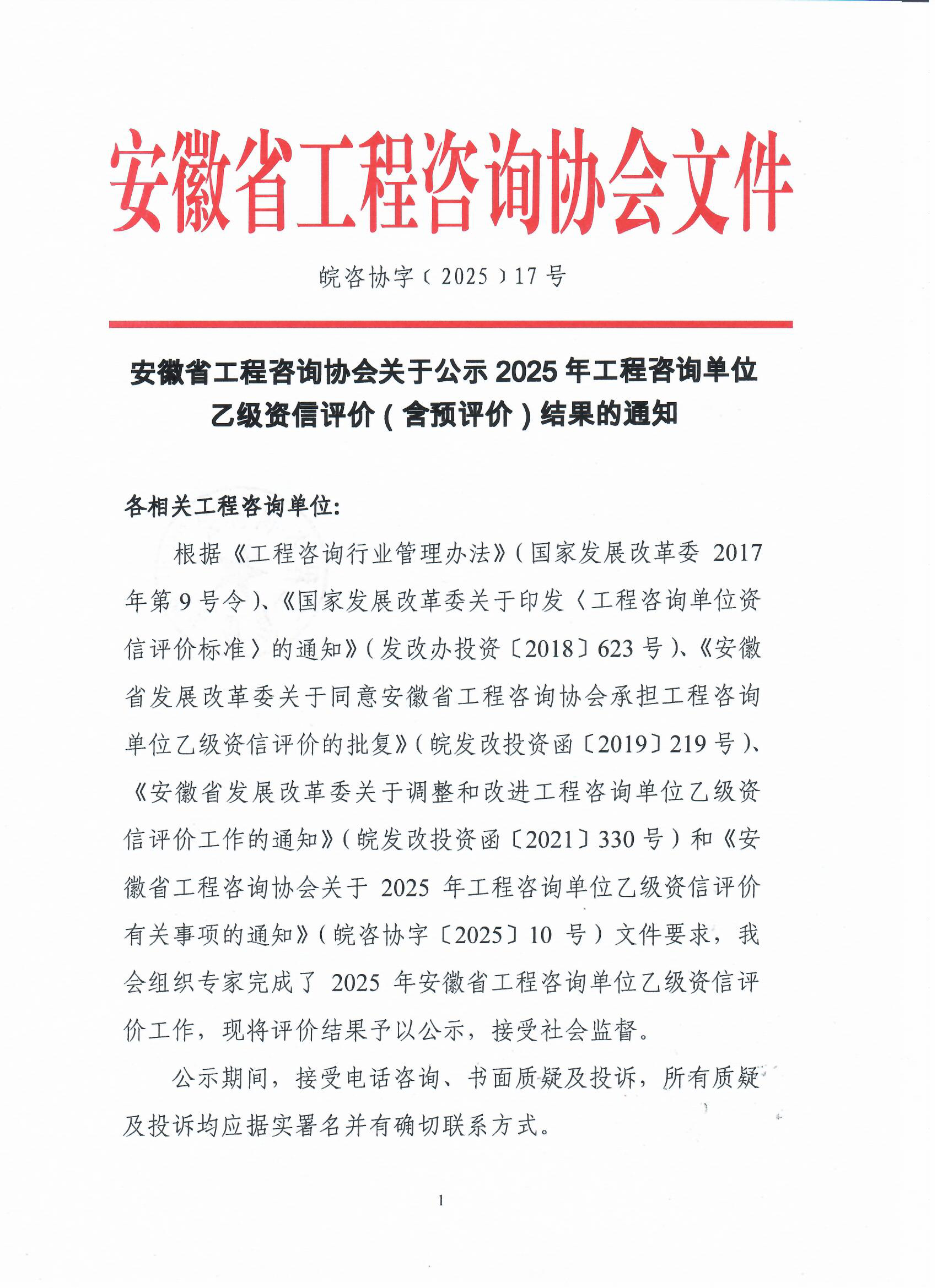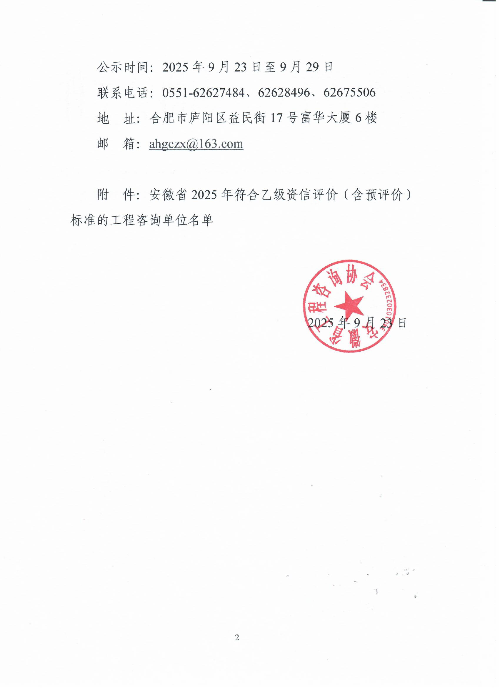 安徽省工程咨询协会关于公示2025年工程咨询单位乙级资信评价(含预评价)结果的通知
