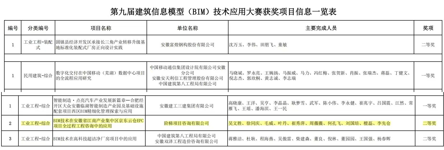 根据《关于举办第九届建筑信息模型(BIM)技术应用大赛的通知》(皖设协〔2025〕59号),大赛获奖项目提名信息已于2025年12月9日至12月17日公示,经审定,现对获奖项目名单予以公布(见附件)。