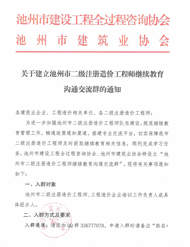 为进一步加强池州市二级注册造价工程师队伍建设,规范继续教育管理工作,畅通政策通知渠道,搭建专业交流平台,切实保障我市二级注册造价工程师及时获取继续教育相关信息,顺利完成学习任务,池州市建设工程全过程咨询协会、池州市建筑业协会特设立 “池州市二级注册造价工程师继续教育沟通交流群”。群号为:336777078,请各二级造价工程师积极加群,获取相关信息。