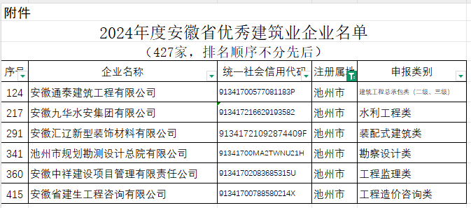 安徽省住建厅关于公布2024年度安徽省优秀建筑业企业名单的通知